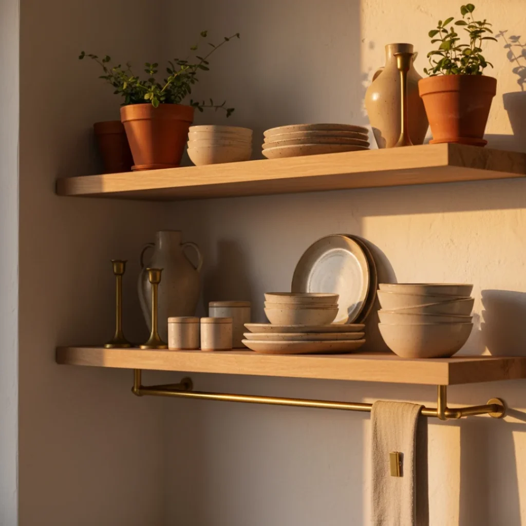Bring balance and calm into your kitchen with open shelves styled in warm earth tones. Perfect for a natural, modern look that radiates peace and warmth.